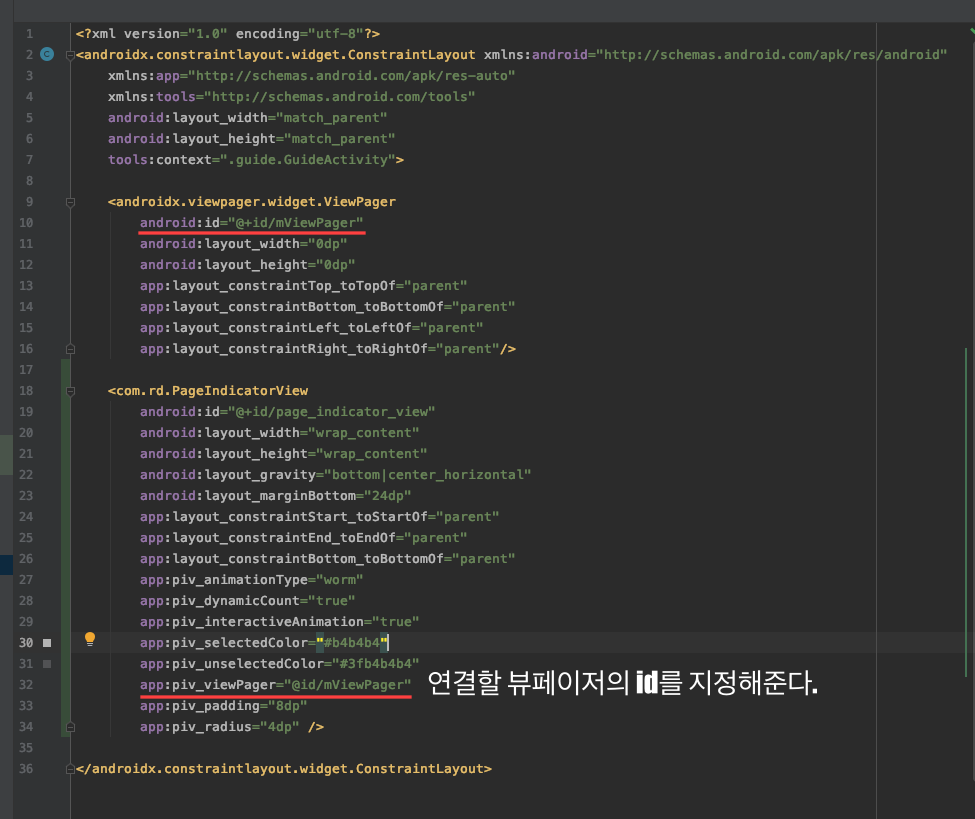 그리고 레이아웃 xml 파일에서 PageIndicatorView를 작업해줍니다.