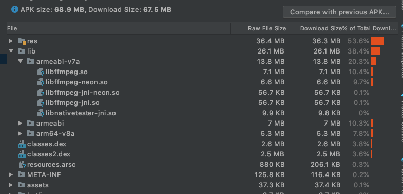 이렇게하면 libffmpeg.so 파일이 포함되어 있지 않으며, 이전의 파일보다 용량이 작은것을 알 수 있다.