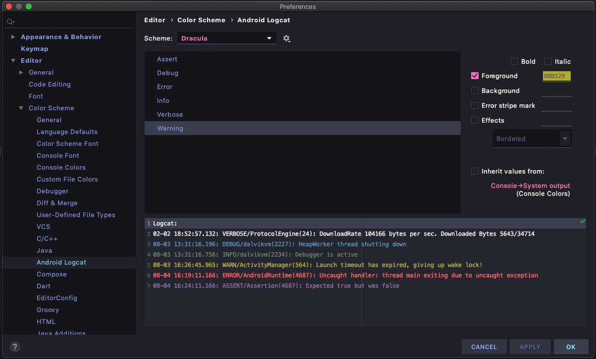 1. 설정화면에서 [Editor] -> [Color Scheme] -> [Android Logcat] 으로 이동합니다.
