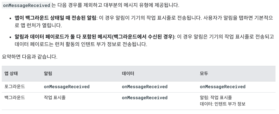 Firebase 알림의 동작은 수신하는 앱의 포그라운드/백그라운드 상태에 따라 달라집니다. 포그라운드 상태인 앱에서 알림 메시지 또는 데이터 메시지를 수신하려면 onMessageReceived 콜백을 처리하는