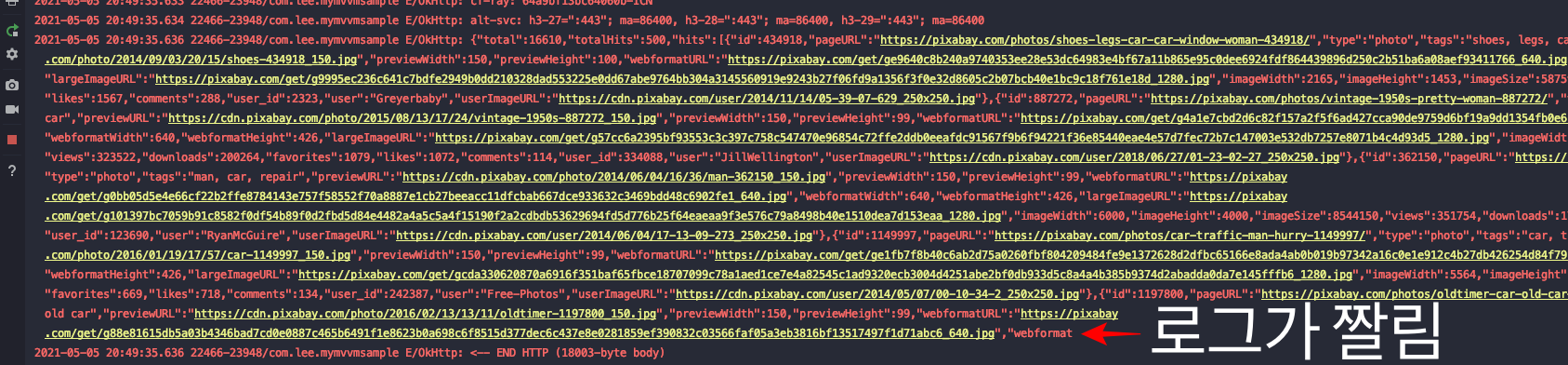 Log가 중간에 짤리는것을 볼 수 있습니다.