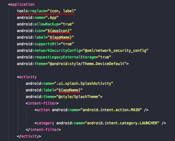 그리고 <application> 안에 tools:replace="icon, label" 추가해야만 gradle 설정한 appName, appIcon 매핑이 됩니다.