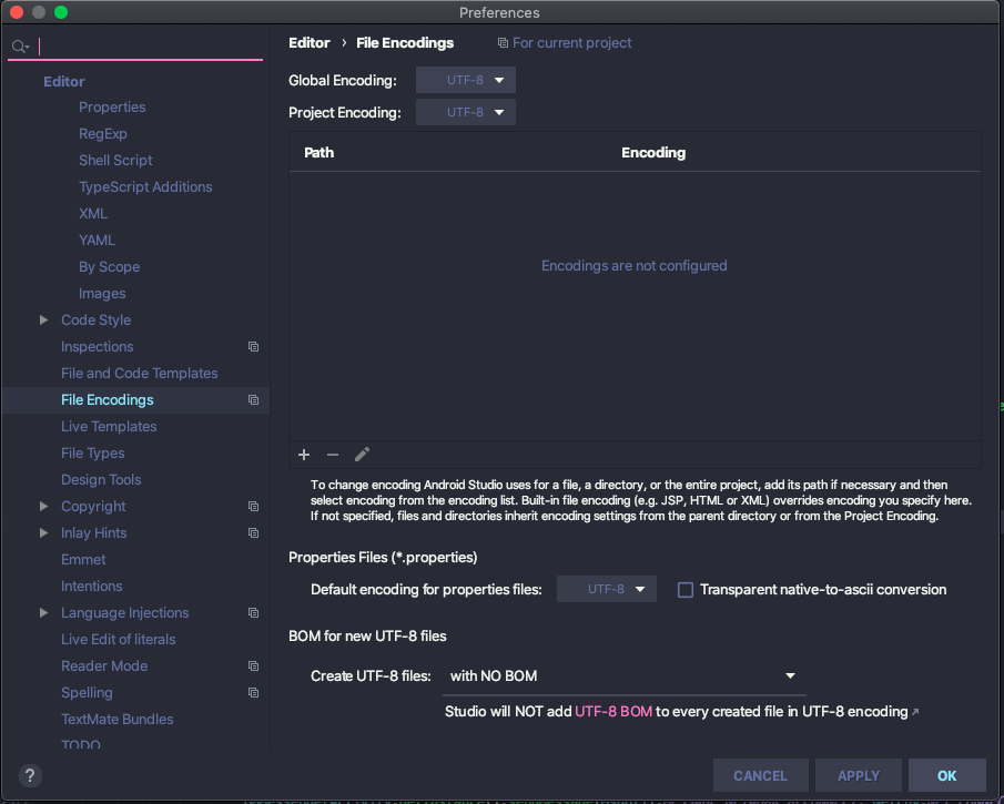 Preference > File Encodings 에 가보니 모두 정상적으로 UTF-8 로 인코딩 설정이 되어 있었습니다.