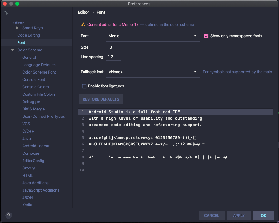 Preference > Editor > Font 에 가서 확인해봤지만 큰 문제는 없어보입니다.
