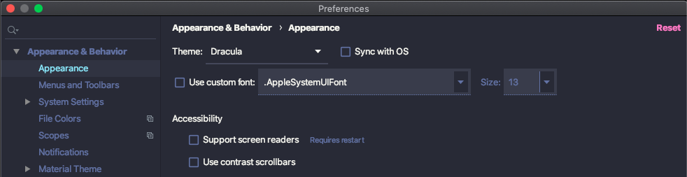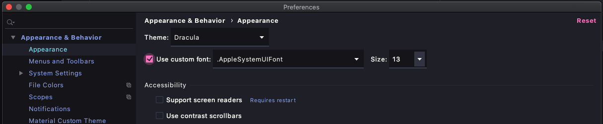 Preference > Appearance 메뉴에서 Use custom font 를 체크하고 Apply 를 눌러줍니다.
