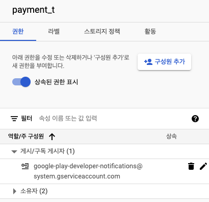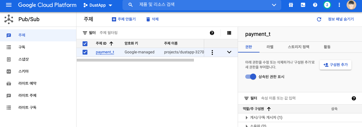 구글 클라우드플랫폼 Pub/Sub 에서 생성한 주제를 클릭해보면 브라우저 우측에 [구성원 추가] 버튼이 보입니다.