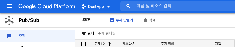 Pub/Sub 메뉴에서 [주제 만들기] 를 눌러서 주제를 생성합니다.