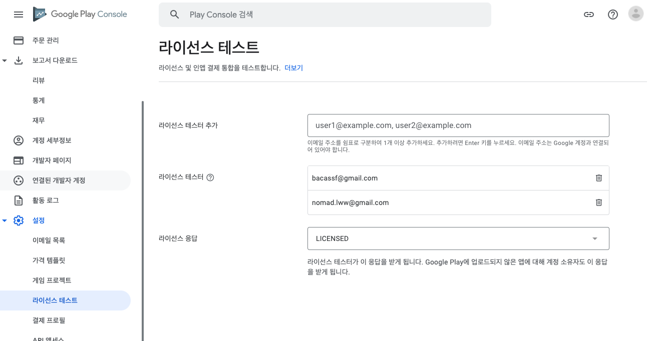 구글 플레이스토어 콘솔에서 [설정] > [라이선스 테스트] 메뉴에 들어가 테스터를 등록해줍니다.