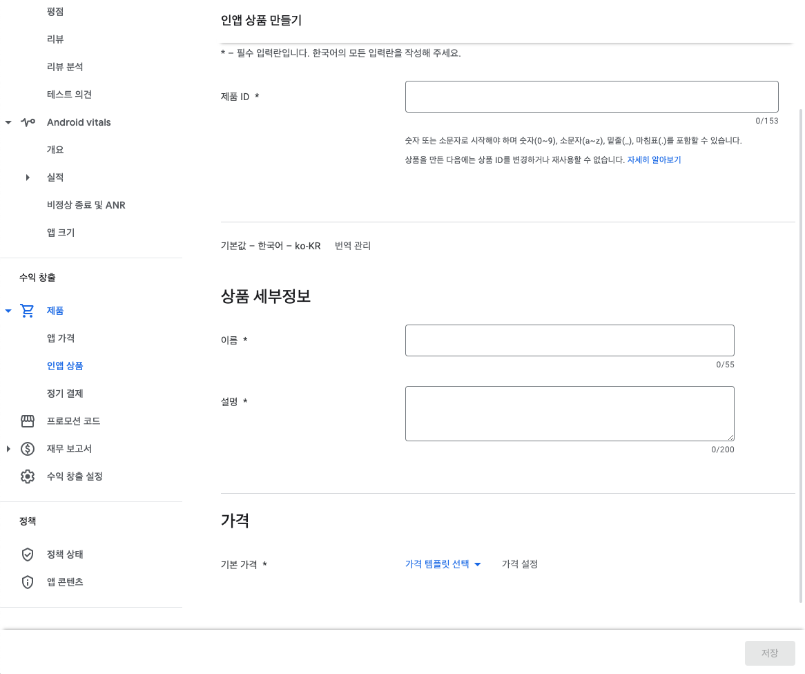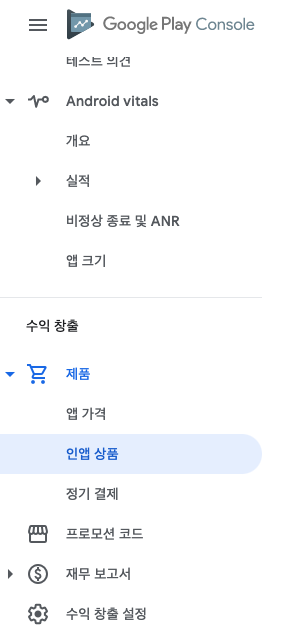 구글 플레이스토어 콘솔에서 인앱결제 아이템을 만들기 위해 [수익 창출 설정]이 되어야 합니다.