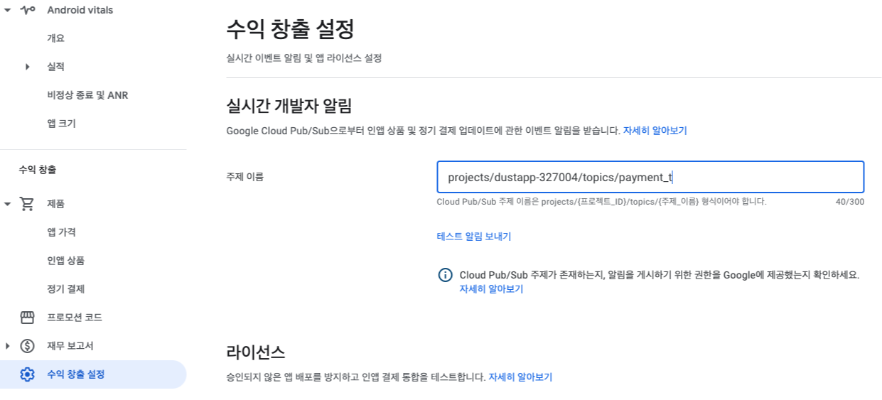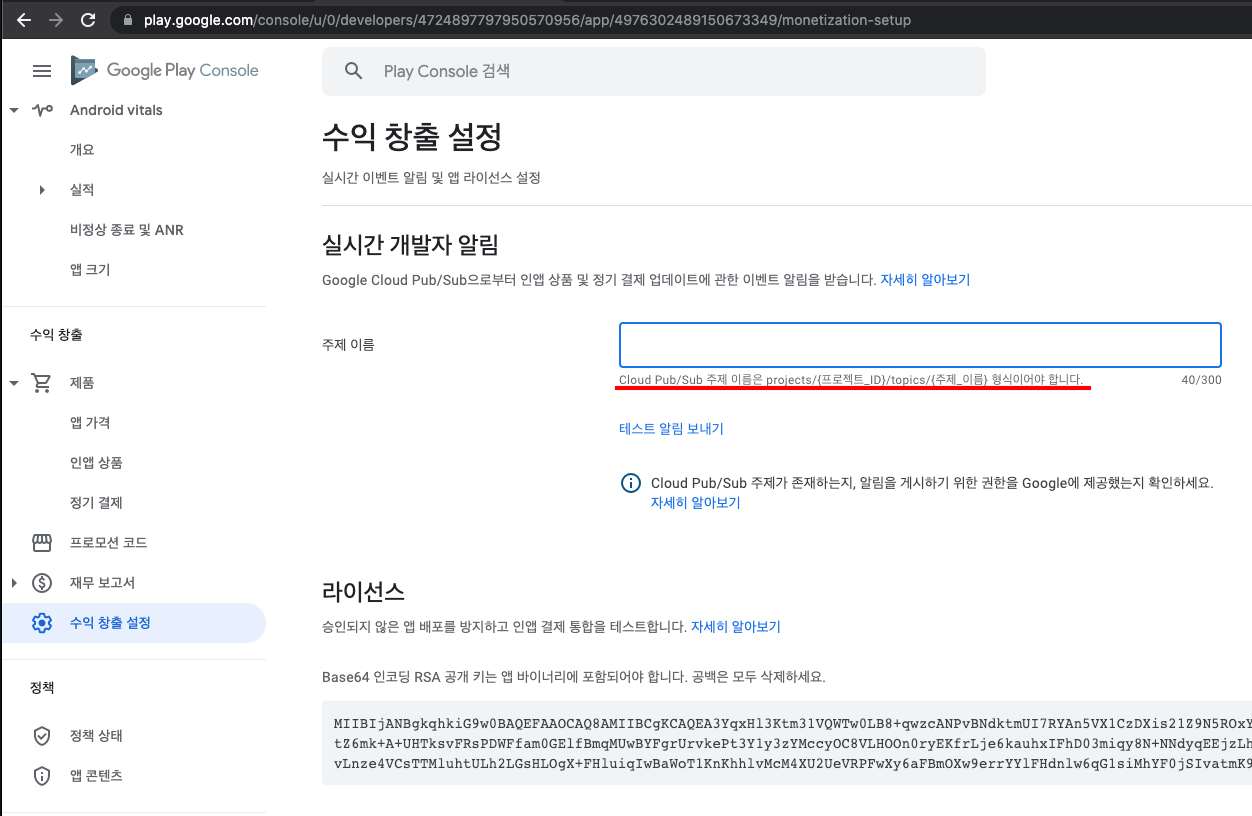 주제를 생성하면 플레이스토어 콘솔의 [수익 창출 설정] 메뉴에서 봤던