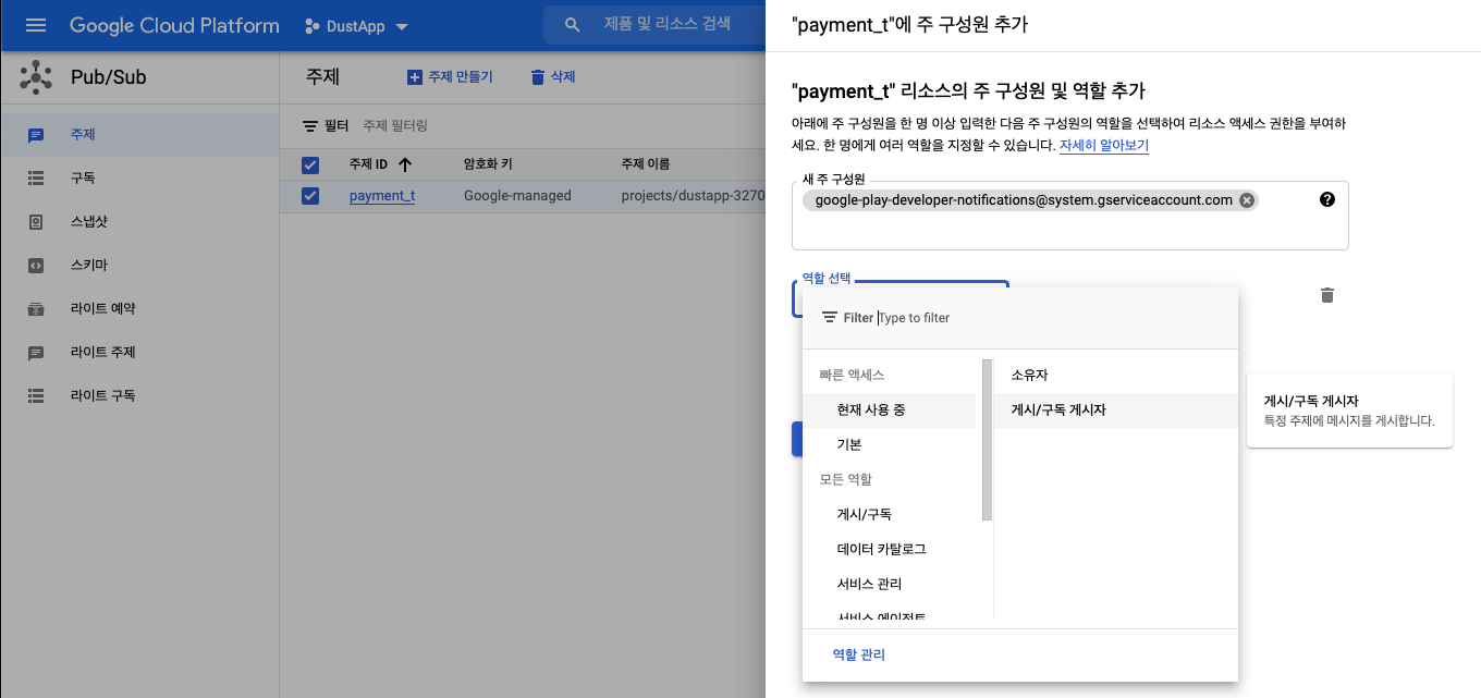여기서 아래의 서비스 계정을 추가하여 Pub/Sub 게시자 역할을 부여합니다.
