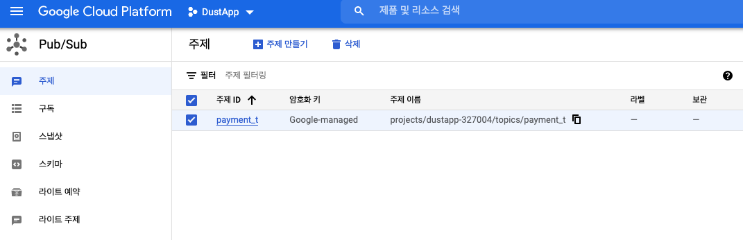 projects/{프로젝트_ID}/topics/{주제_이름} 형식의 주제이름이 생성됩니다.