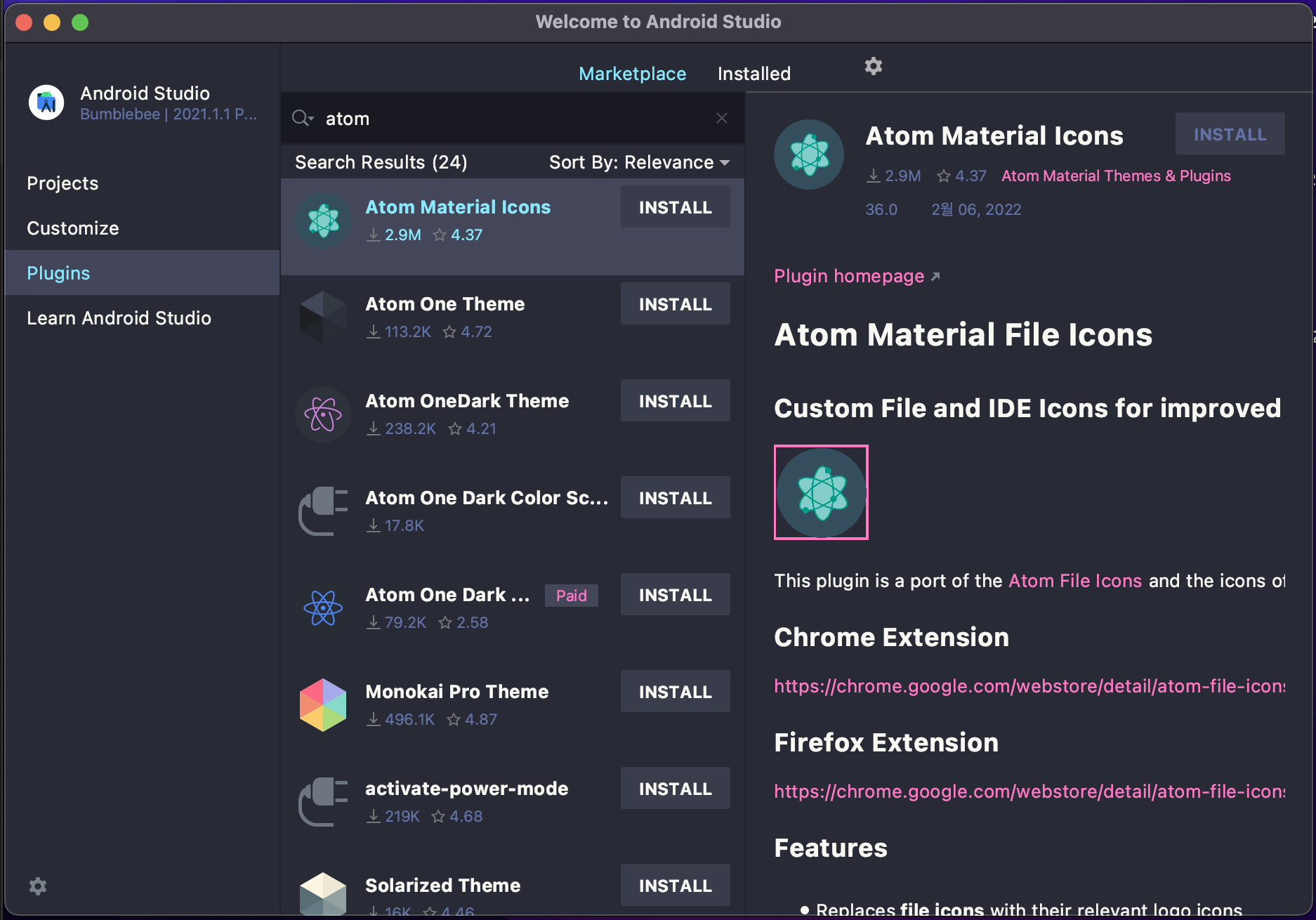 안드로이드 스튜디오 환경설정에서 플러그인 메뉴에서 검색하고 설치할 수 있습니다.