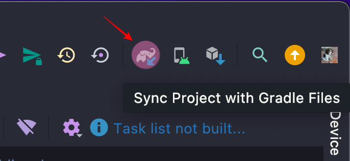이때 Tasks 메뉴가 보이지 않는다면 위에 Task list not Built...을 누른 후 설정창에서 Do not build Gradle task list during Gradle sync. 를 체크해제 한 후 sync 를 누르면 Tasks 메뉴가 보입니다.