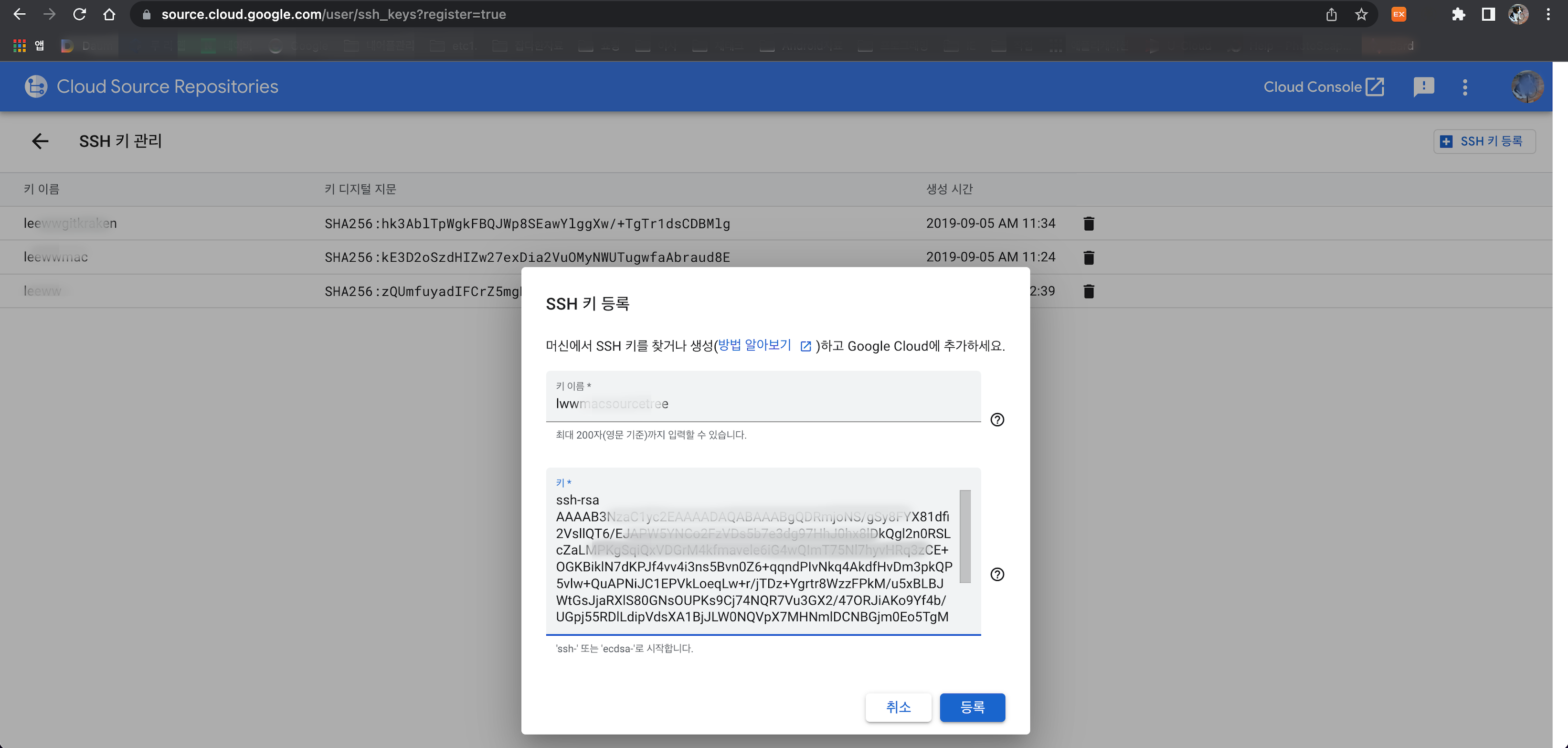 [+SSH 키 등록] 을 눌러서 키의 이름과 아까 복사해둔 ssh key 값을 붙여넣기 한 후 [등록]을 누르면 됩니다.