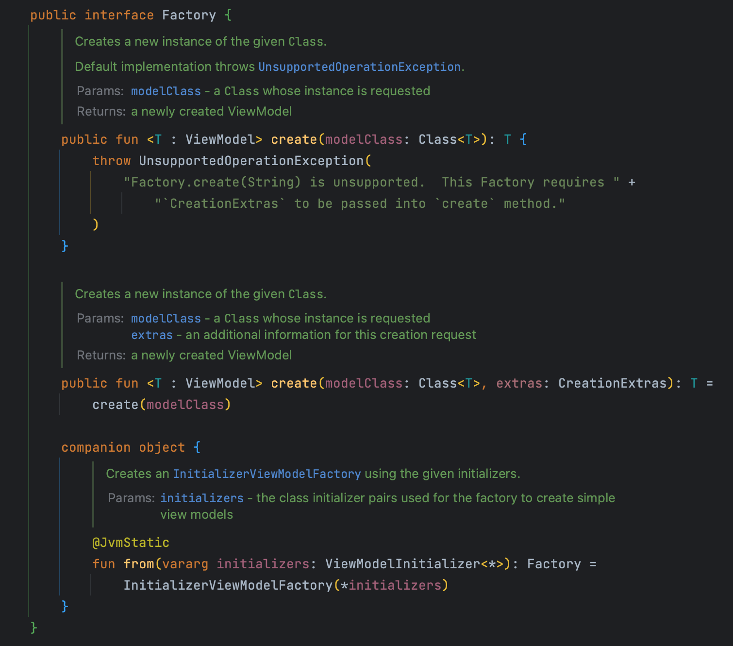 우선 ViewModelProvider.kt 파일의 Factory 인터페이스 소스를 살펴보겠습니다.