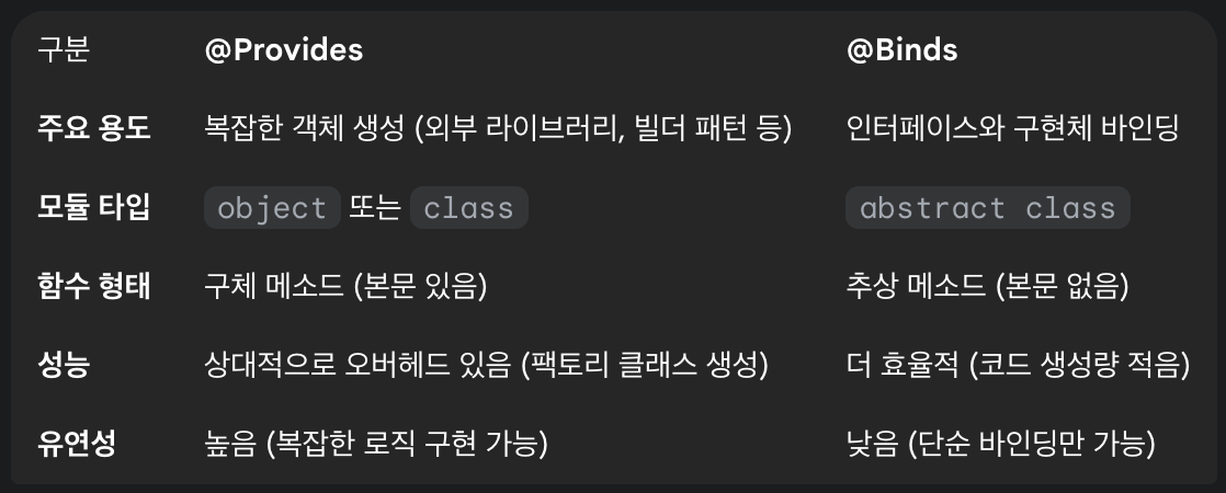 `@Provides`로도 동일한 기능을 구현할 수 있지만, 불필요한 오버헤드가 발생하게 됩니다.