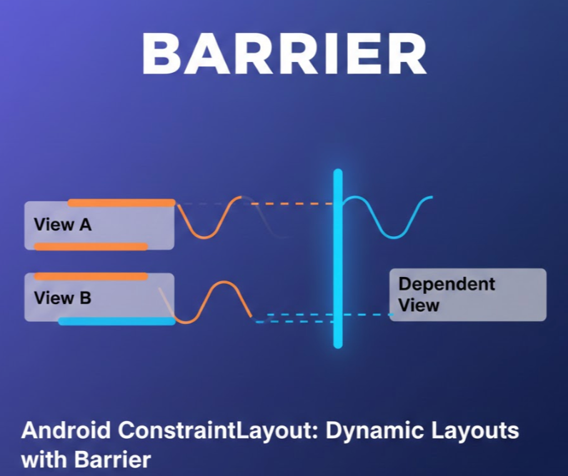 Barrier(배리어)는 말 그대로 **'가상의 벽'**입니다. ConstraintLayout에서 제공하는 Helper 객체로, 화면에 직접 나타나지는 않지만 여러 개의 뷰를 묶어서 그 뷰들의 경계선을 동적으로 만들어 줍니다.
