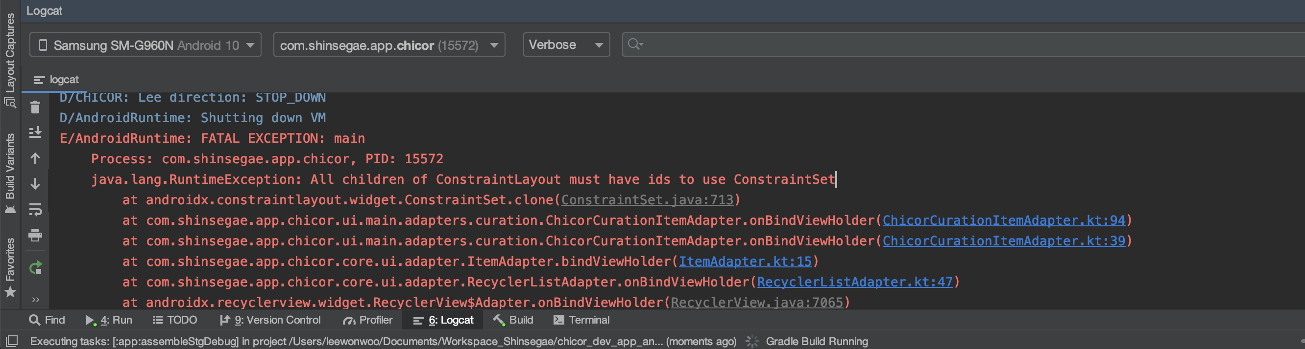 bacass 2020. 5. 22. 18:04레이아웃을 수정한 후 앱을 재시작해보니 곧바로 죽는 현상이 발생했습니다.