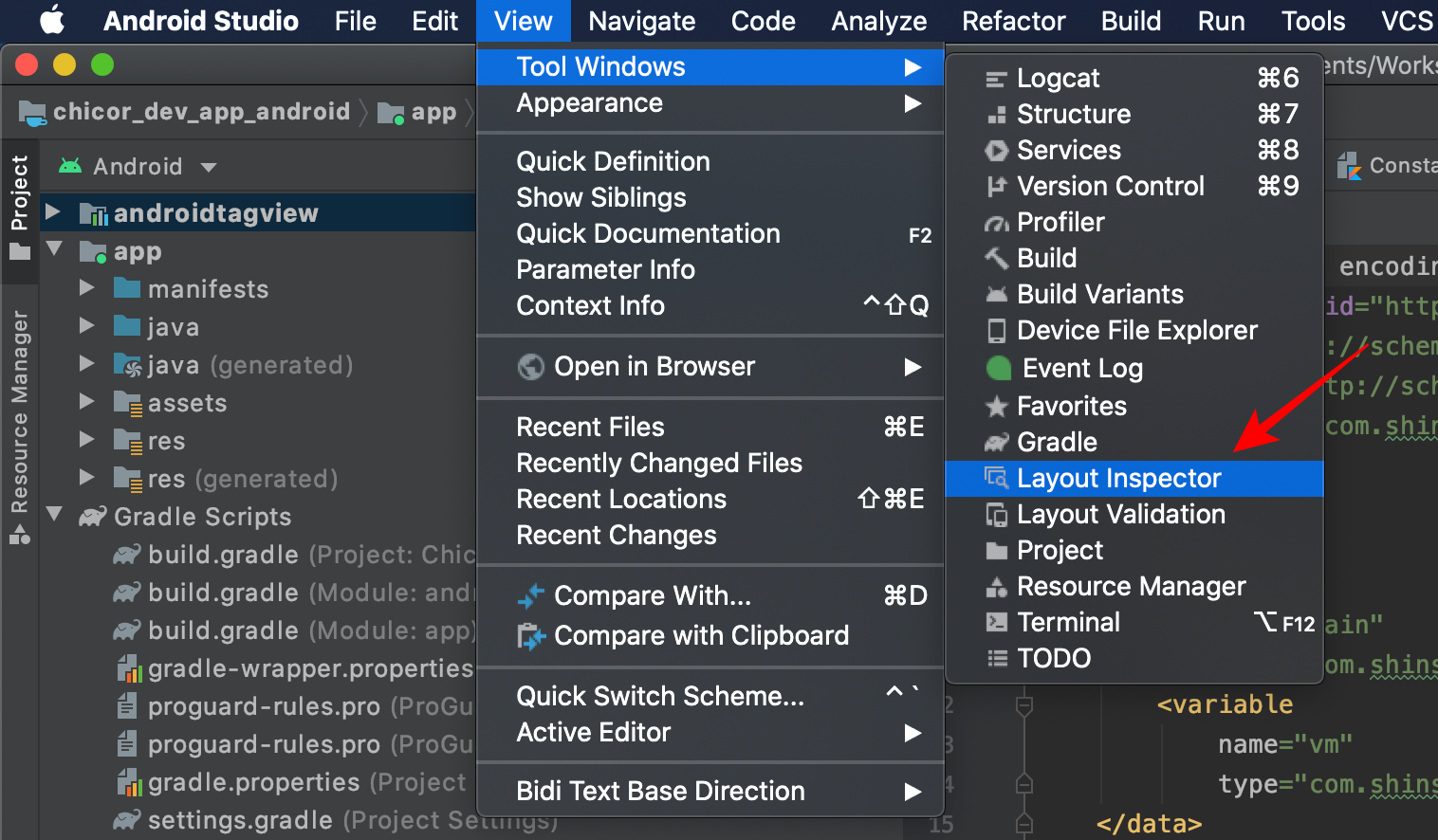 Layout Inspector 창은 View > Tools Windows > Layout Inspector를 선택하면 사용할 수 있습니다.