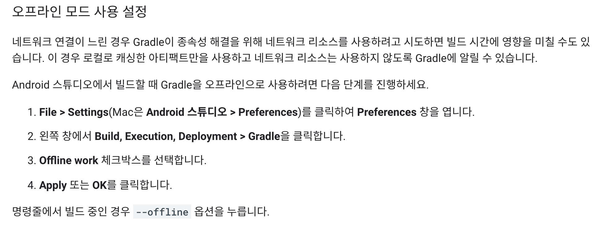 이럴경우 안드로이드 스튜디오의 빌드 셋팅을 오프라인 상태로 설정해야 합니다.