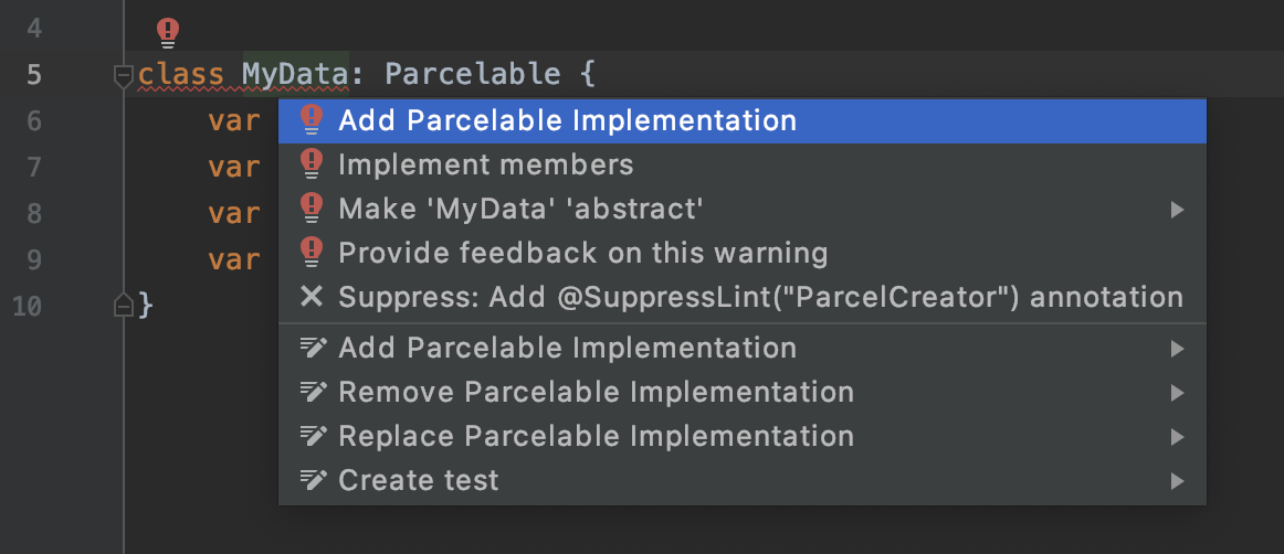 Parcelable에서 구현해줘야하는 생성자, writeToParcel, CREATOR 등이 자동으로 생성됩니다.