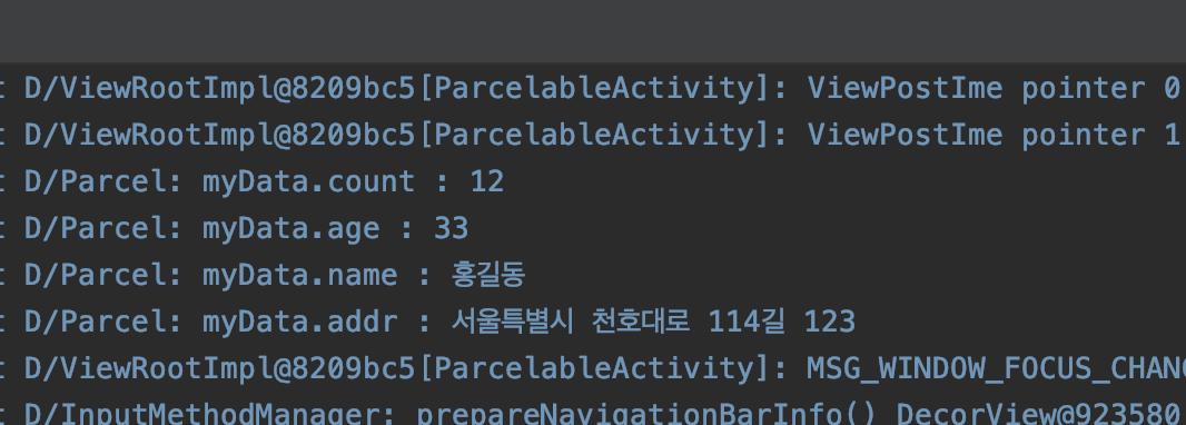 Log.d("Parcel", "myData.addr : ${myData?.addr}")