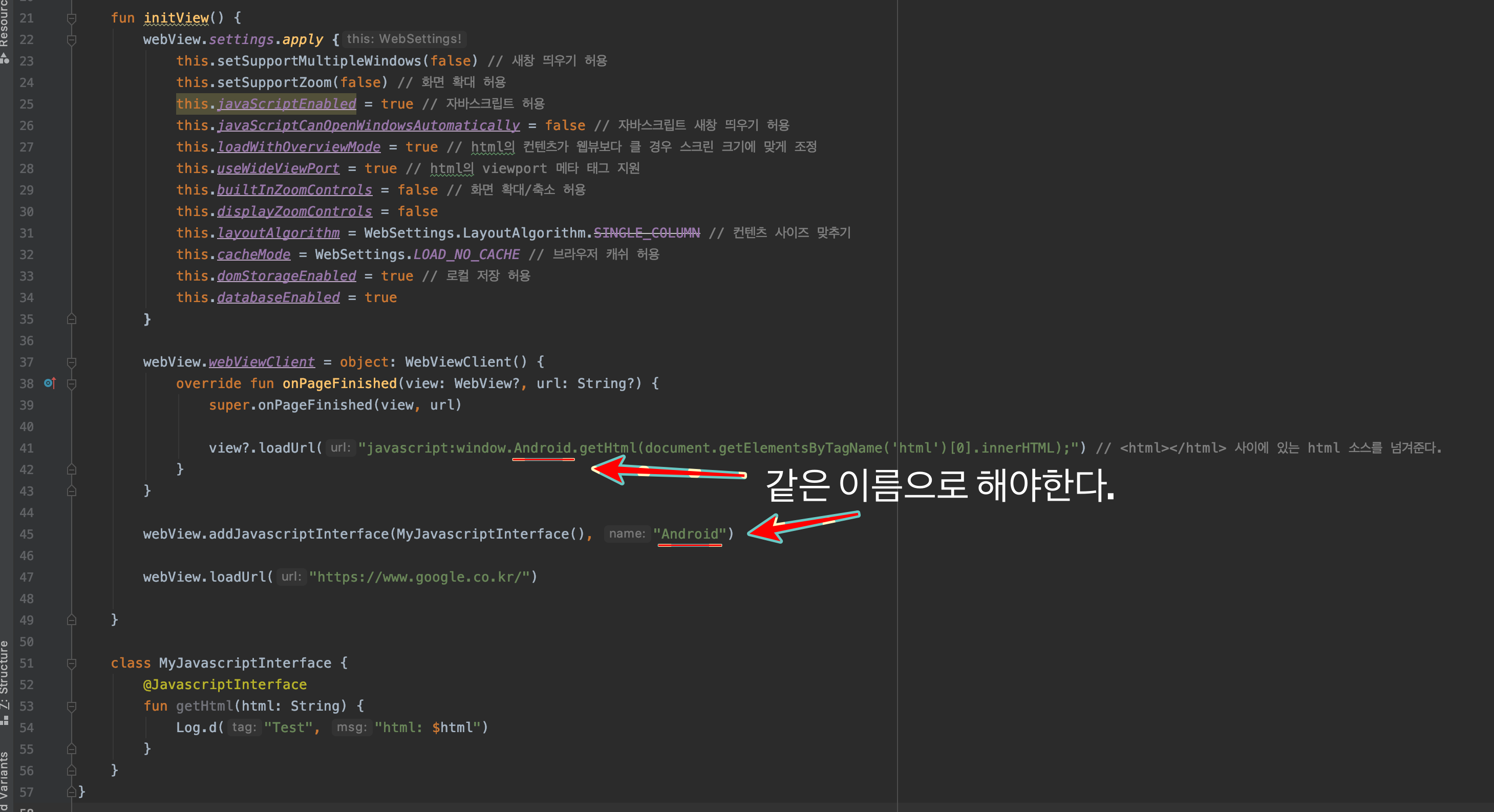 view?.loadUrl("javascript:window.Android.getHtml(document.getElementsByTagName('html')[0].innerHTML);") // <html></html> 사이에 있는 html 소스를 넘겨준다.